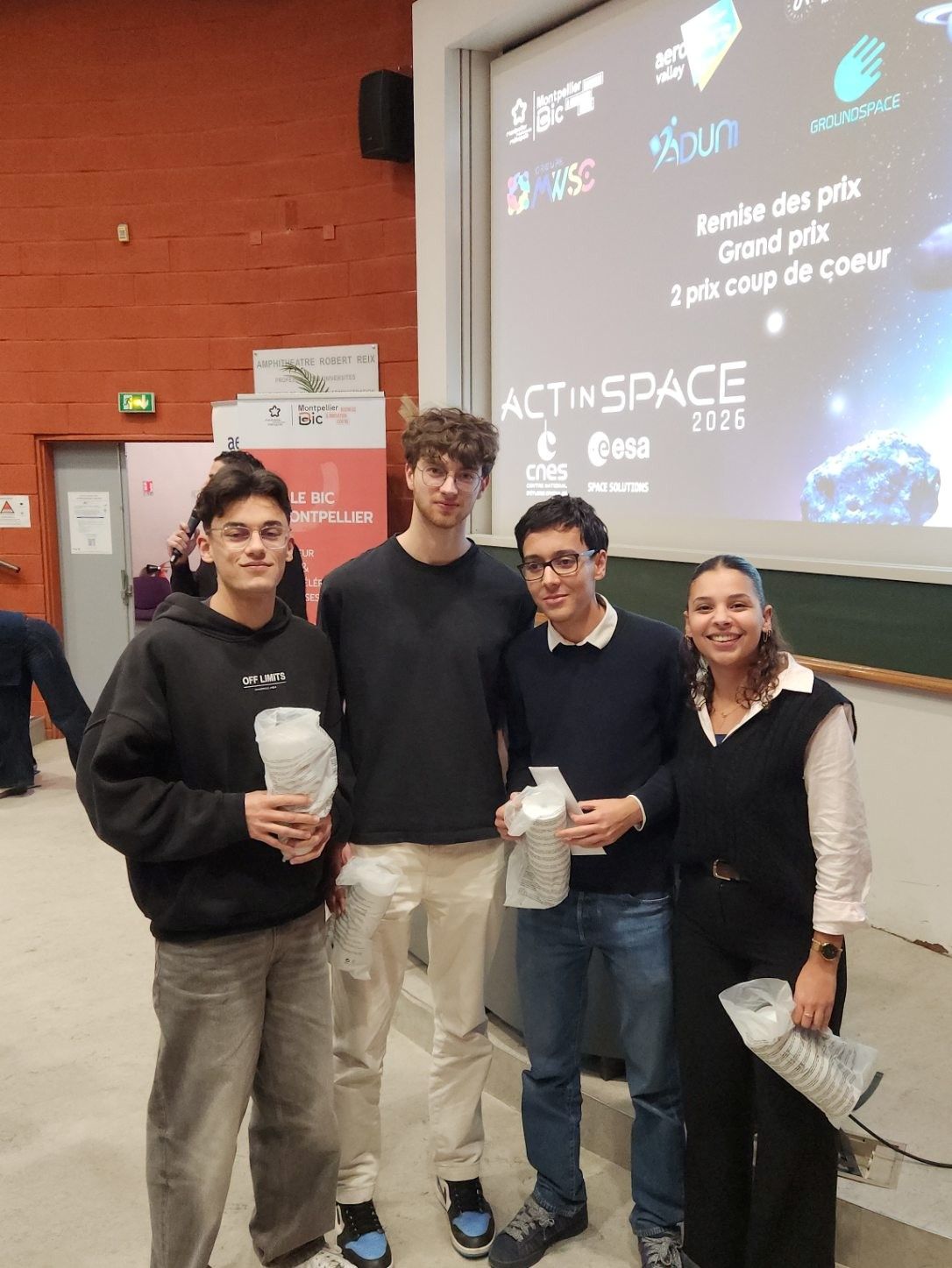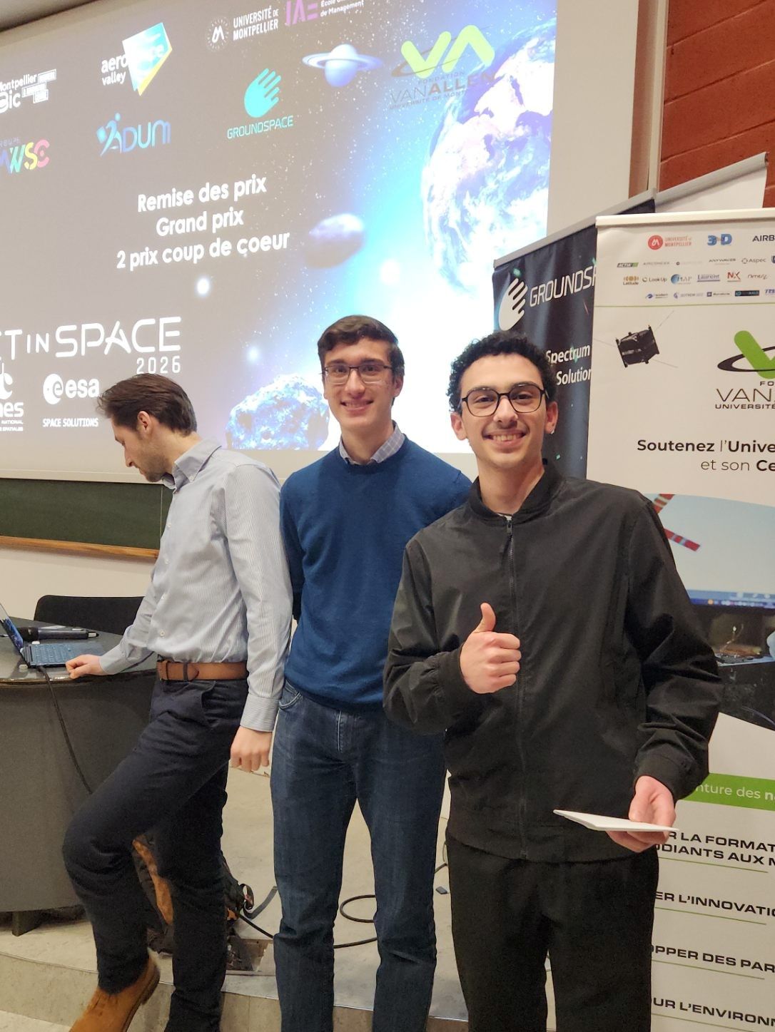 - Le prix coup de cœur du jury est attribué au projet Nexus&Space. Cette équipe a imaginé une solution de standardisation « Plug & Play » pour les satellites, composée d’étudiants de Polytech Montpellier filière Microélectronique et Automatique -MEA, 1ère année de Cycle Ingénieur : Gibril Sahli, Ethan Huchet, Noëlie Azdad, Aurélien Goumain.