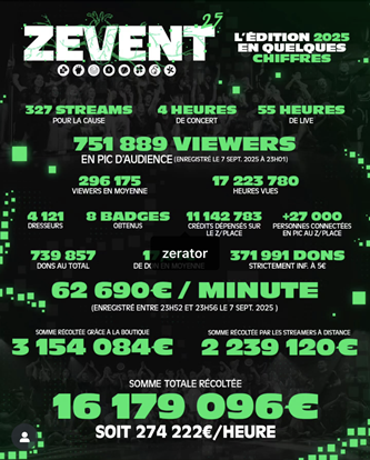 - Coup d’œil sur : Le ZEVENT 2025 : Un week-end de streaming solidaire exceptionnel à Montpellier, réunissant créateurs, joueuses, joueurs et fans autour d’une même cause caritative. Près de 300 streamers mobilisés ont permis de collecter plus de 16,18 millions d’euros, reversés aux associations suivantes : Association Française des Aidants, Hélébor, La Ligue contre le Cancer, Nightline et Pôle Enfance.