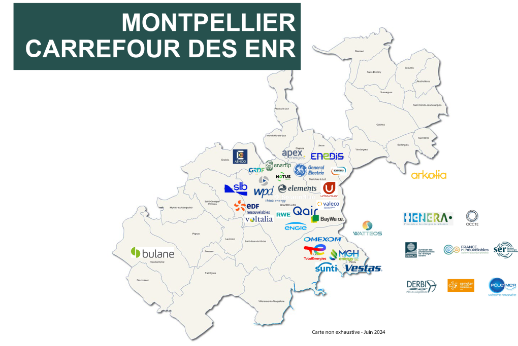 La métropole de Montpellier compte, parmi ses quelque 300 acteurs des EnR , plus de 170 entreprises. Figurent parmi elles Apex Énergies, Aenco, GRDF, Enerfip, Grid Solutions (General Electric), Bouygues, SLB, WPD, EDF Power Solutions, SolarinBlue, Voltalia, RWE Renouvelables, Qair, Valeco, Engie Green, BayWa r.e., TotalÉnergies Revouvelables et Vestas.