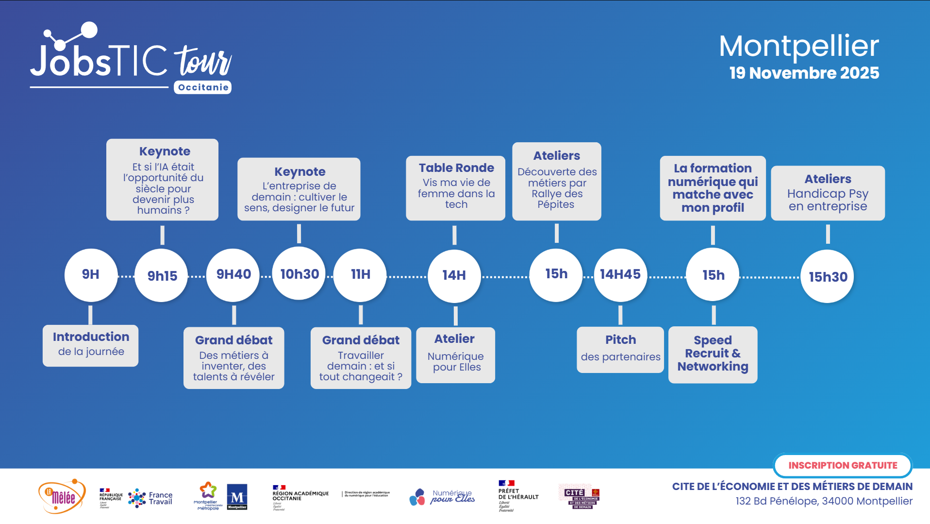Le JobsTIC TOUR continue avec son étape à Montpellier ! La Mêlée vous accueille dans les locaux de la CEMD (Cité de l’Économie et des Métiers de demain).